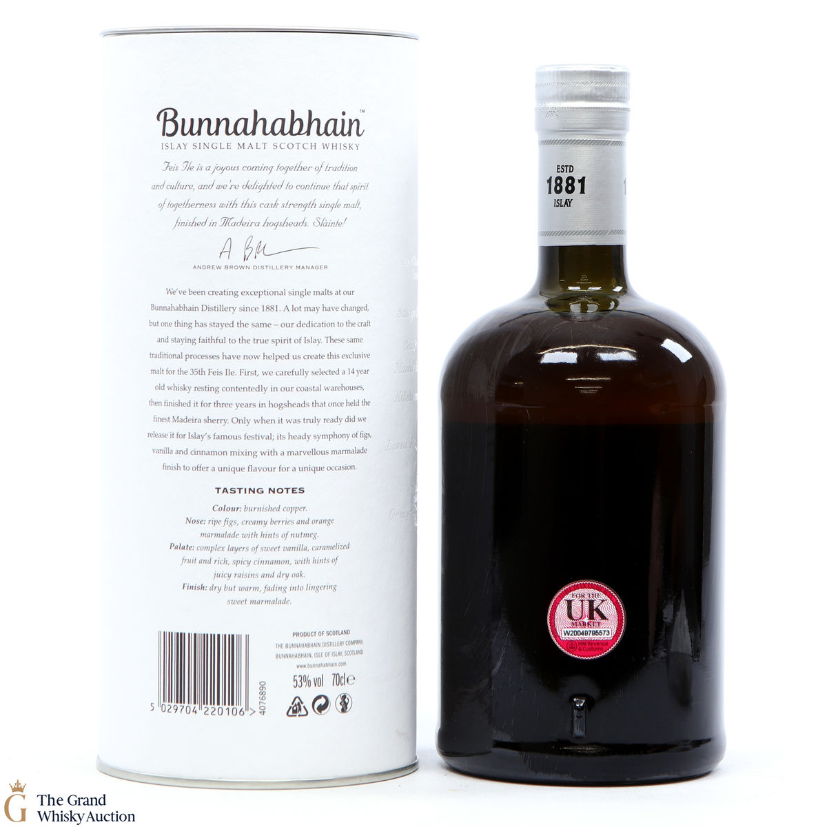 This limited edition single malt from Bunnahabhain Distillery was matured for 14 years in classic bourbon barrels, then finished in Maderia casks for another three years. Bottled at 53%, and released by Bunnahabhain for the 25th anniversary of Fèis Ìle - Fèis Ìle 2020. This is one of only 1164 bottles produced.