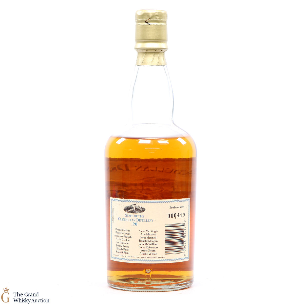 The label on the back of the bottle features the 16 staff of the distillery in 1998.