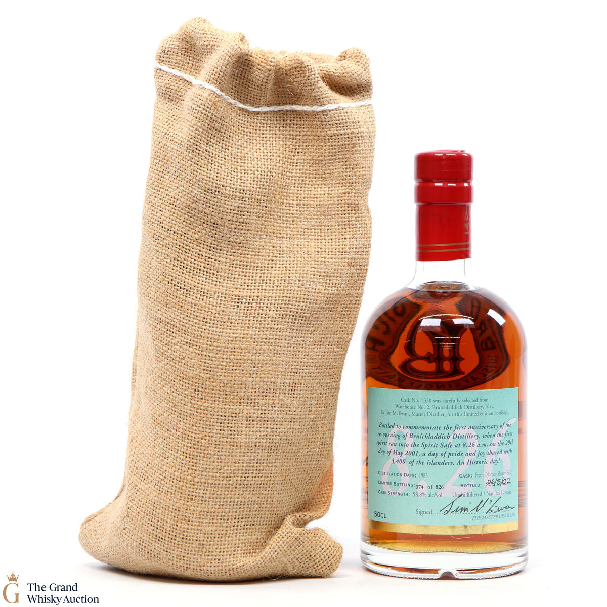 This rare Bruichladdich Islay Single Malt was bottled to mark the first anniversary of the reopening of Bruichladdich - the first spirit ran into the Spirit Safe at 8.26 am on the 29th of May, 2001.