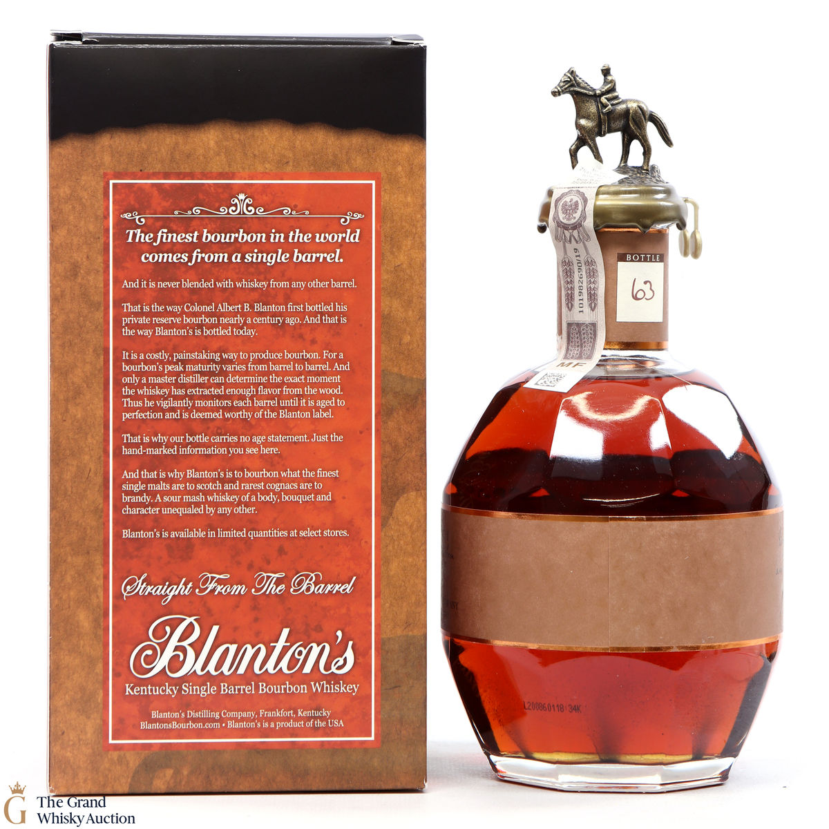 Blanton's Single Bourbon is normally 6 to 8-year-old bourbon, aged in Warehouse H at Buffalo Trace in the metal-clad warehouse at the distillery. The metal, transfers heat quicker than brick warehouses, allowing for faster ageing.