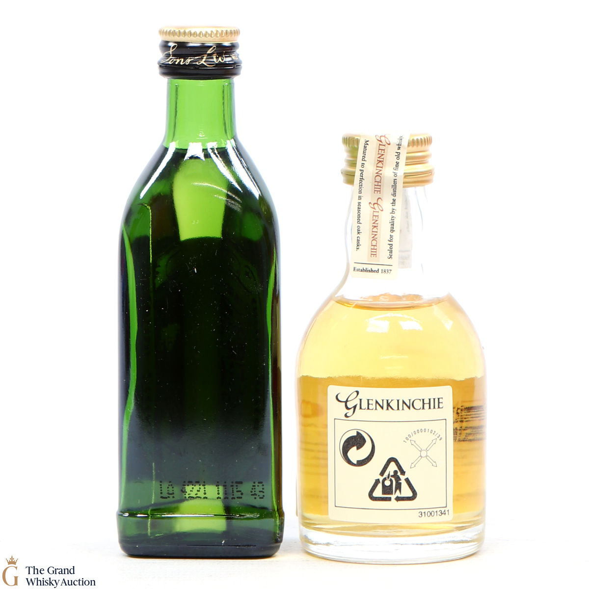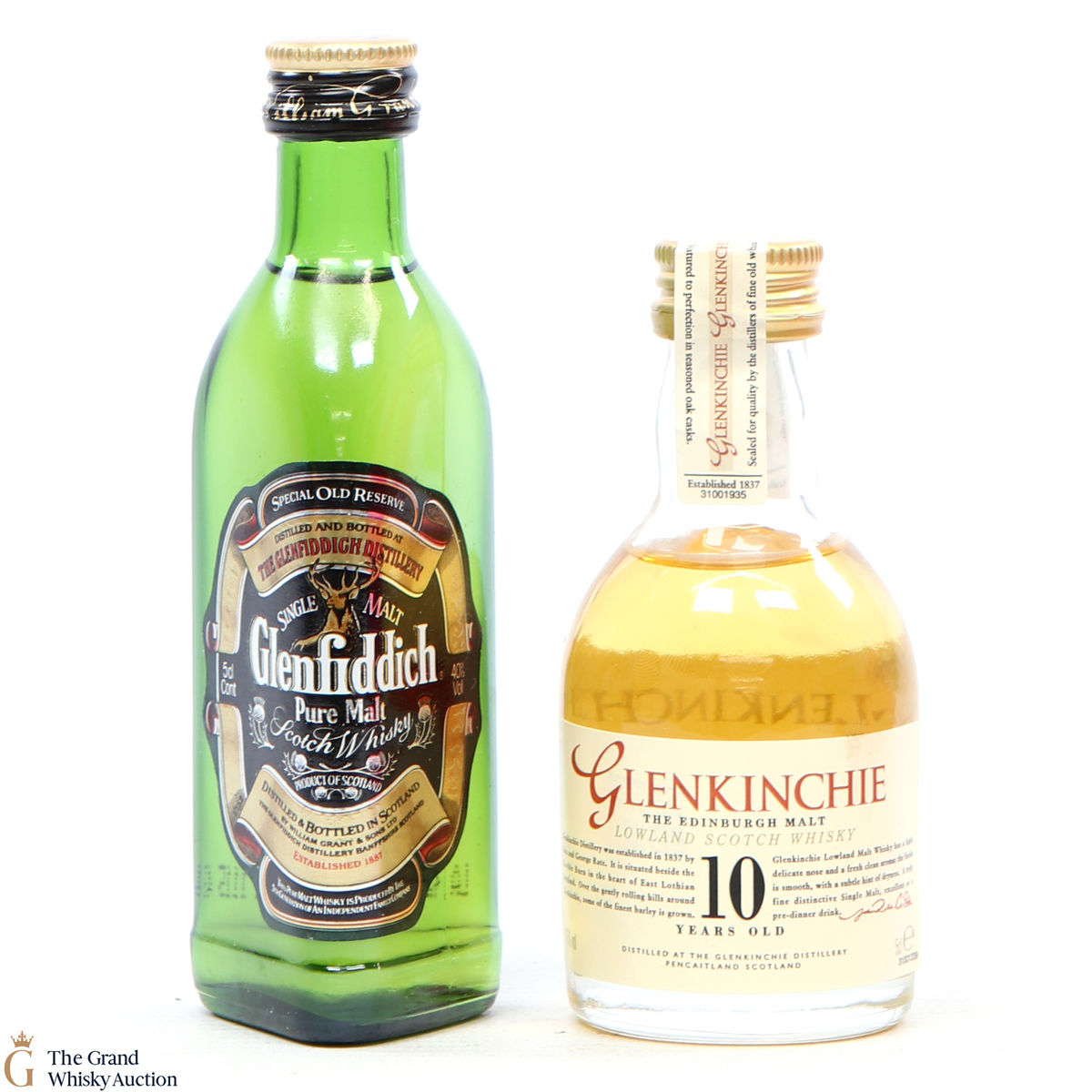 This lot includes Glenfiddich Pure Malt 5cl, 40% & Glenkinchie 10 Year old with branded glass.