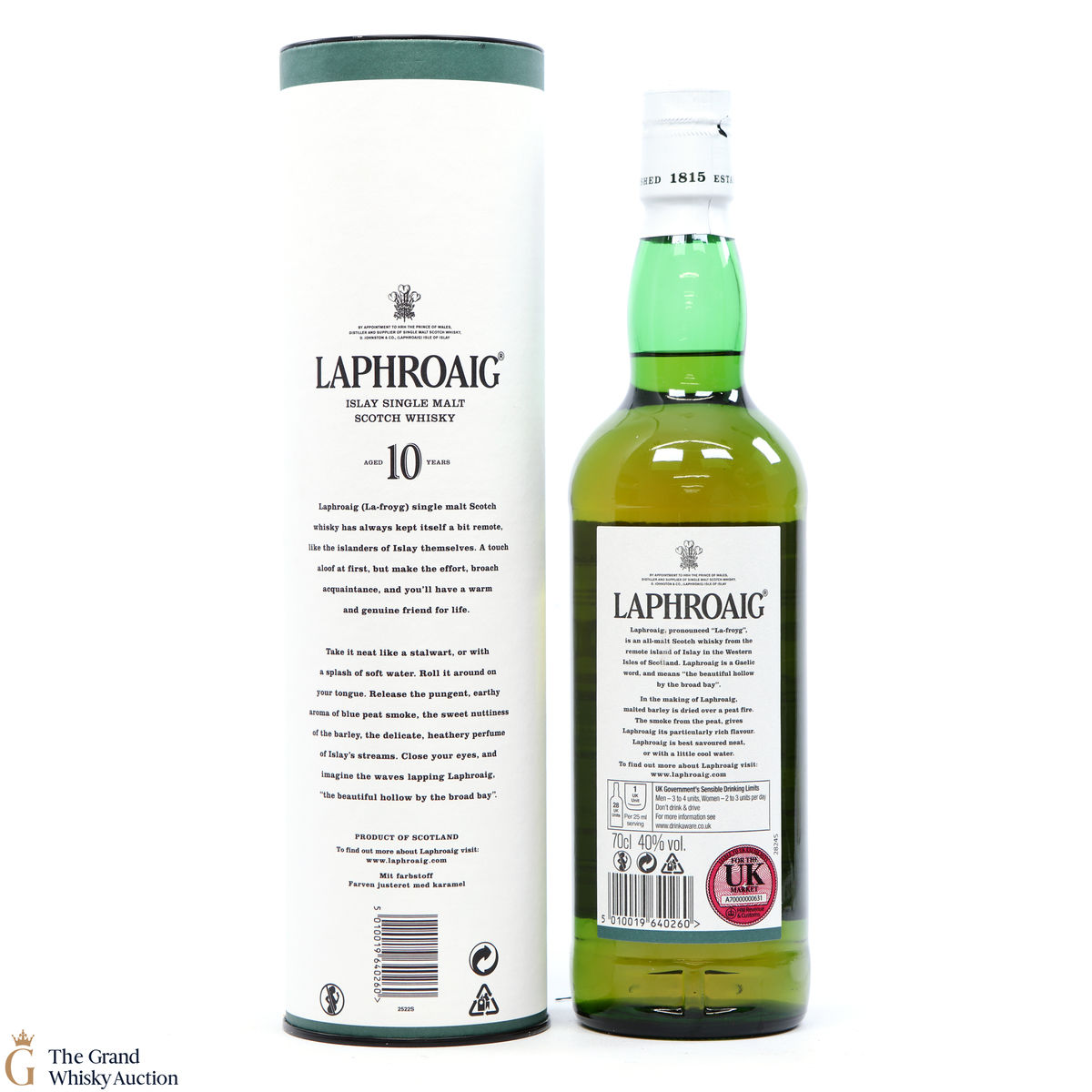A 70cl of the medicinal 10 year old from Islay's bestselling distillery, Laphroaig. In making Laphroaig, malted barley is dried over a peat fire. The smoke from this peat, found only on Islay, gives Laphroaig its particularly rich flavour.