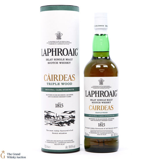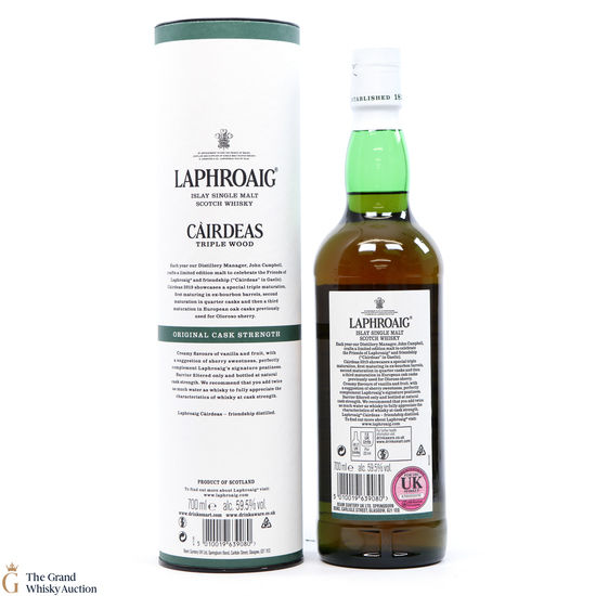 Cairdeas, Gaelic for 'friendship', is an annual bottle release by Laphroaig for their Friends of Laphroaig members. This Càirdeas Triple Wood Cask Strength was released for Fèis Ìle 2019. It has had a special triple maturation; first matured in ex-bourbon barrels, then in quarter casks and finally in European oak casks which previously held oloroso sherry.
