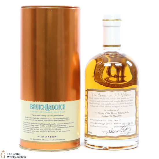 This bottling from Bruichladdich was distilled in 1984 and bottled from a single American Oak cask #12. It was originally only available at Bruichladdich Distillery, released in celebration of the opening of The Harvey Bottling Hall on Sunday 25h of May 2003. This is one of only 575 bottles. This is a 50cl bottling.