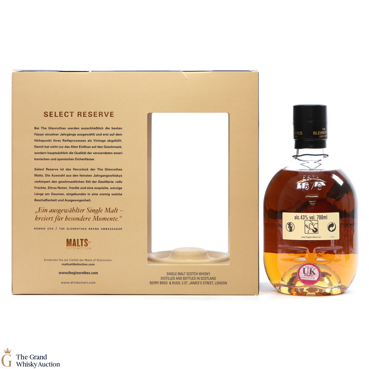 Due to the various ages of bottles and their seals, the condition of liquid is at the buyer's discretion and no claim can be lodged against failure/leakage in transit. Loss and breakage cover is available at 3% of the hammer price as standard. If the lot is not insured, no claim can be lodged against the courier or The Grand Whisky Auction for breakage or loss in transit.