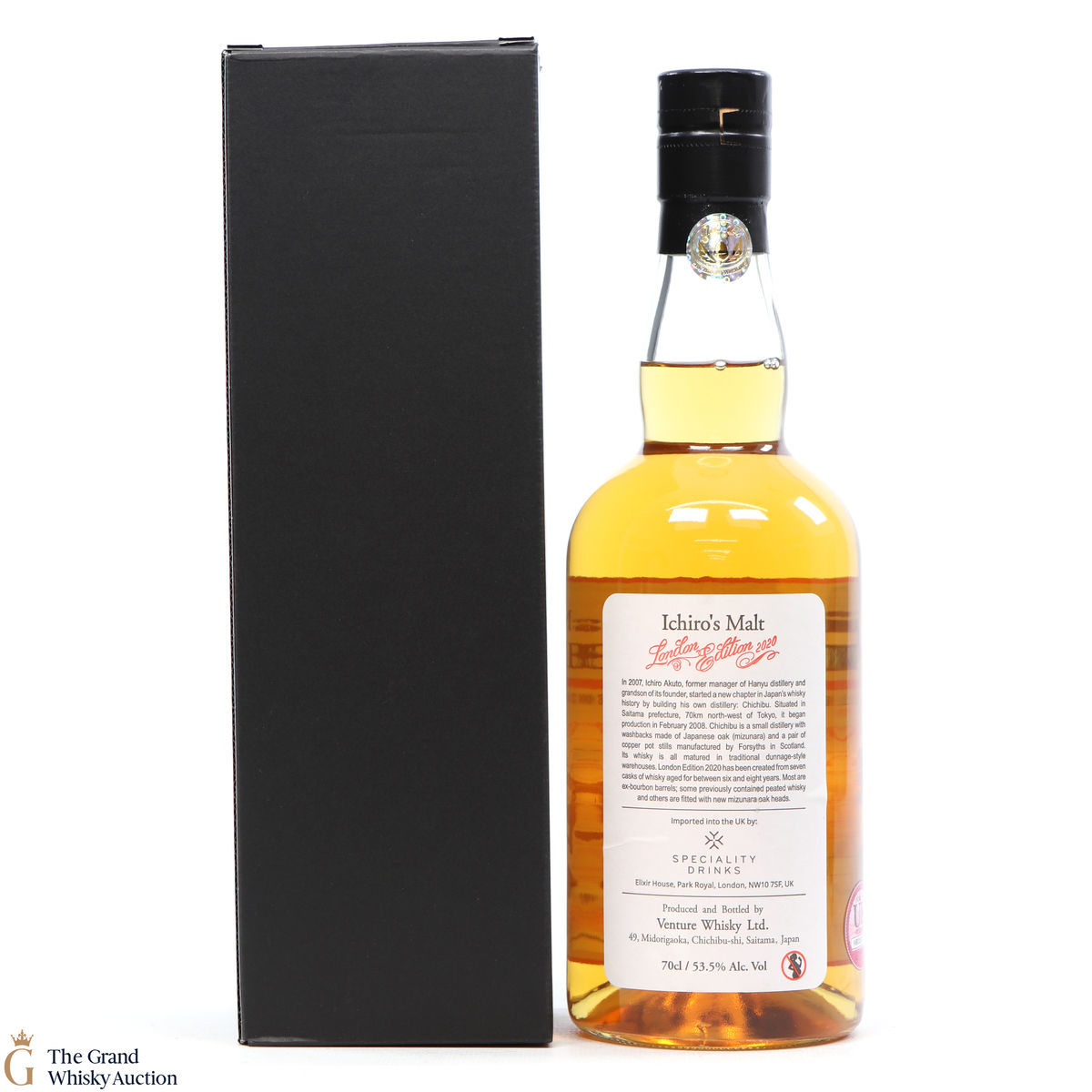 One of just 1736 bottles of the highlight sought after limited-edition Chichibu London (2020) bottlings from the Chichibu Distillery in Japan. Aged for six to eight years and vatted from a total of seven casks including some ex-bourbon barrels previously used to mature peated whisky and casks with new, mizunara-oak ends. Bottled at the cask strength of 53.5% ABV.