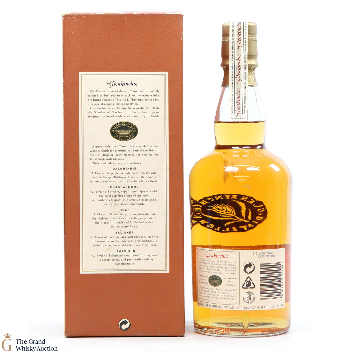 This 10 year old is an older style bottling from Glenkinchie Distillery, that comes presented in the famous orange box - with the classic malt stamp on the front of the box. The Glenkinchie 10 year old has since been replaced by the 12 year old.