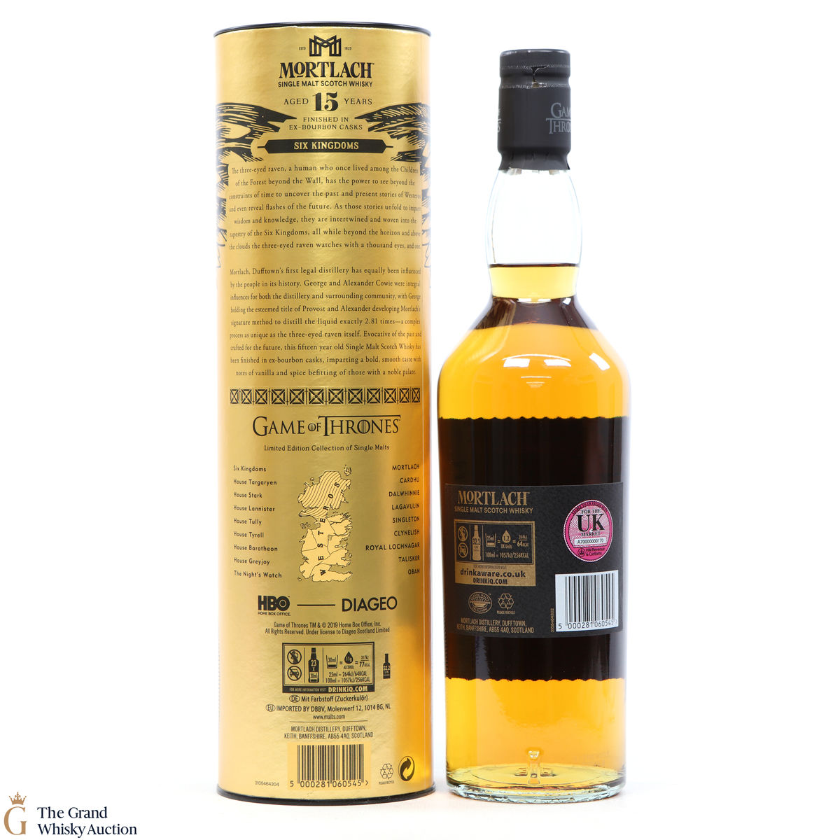 The final bottling in the Game of Thrones Single Malts Collection! The Six Kingdoms - a limited edition, 15-Year-Old Mortlach. Matured in first-fill sherry casks and finished in American oak bourbon casks. It comes in a presented in a metallic gold presentation tube, decorated with a pen and ink drawing of the mysterious three-eyed raven (aka Bran the Broken).