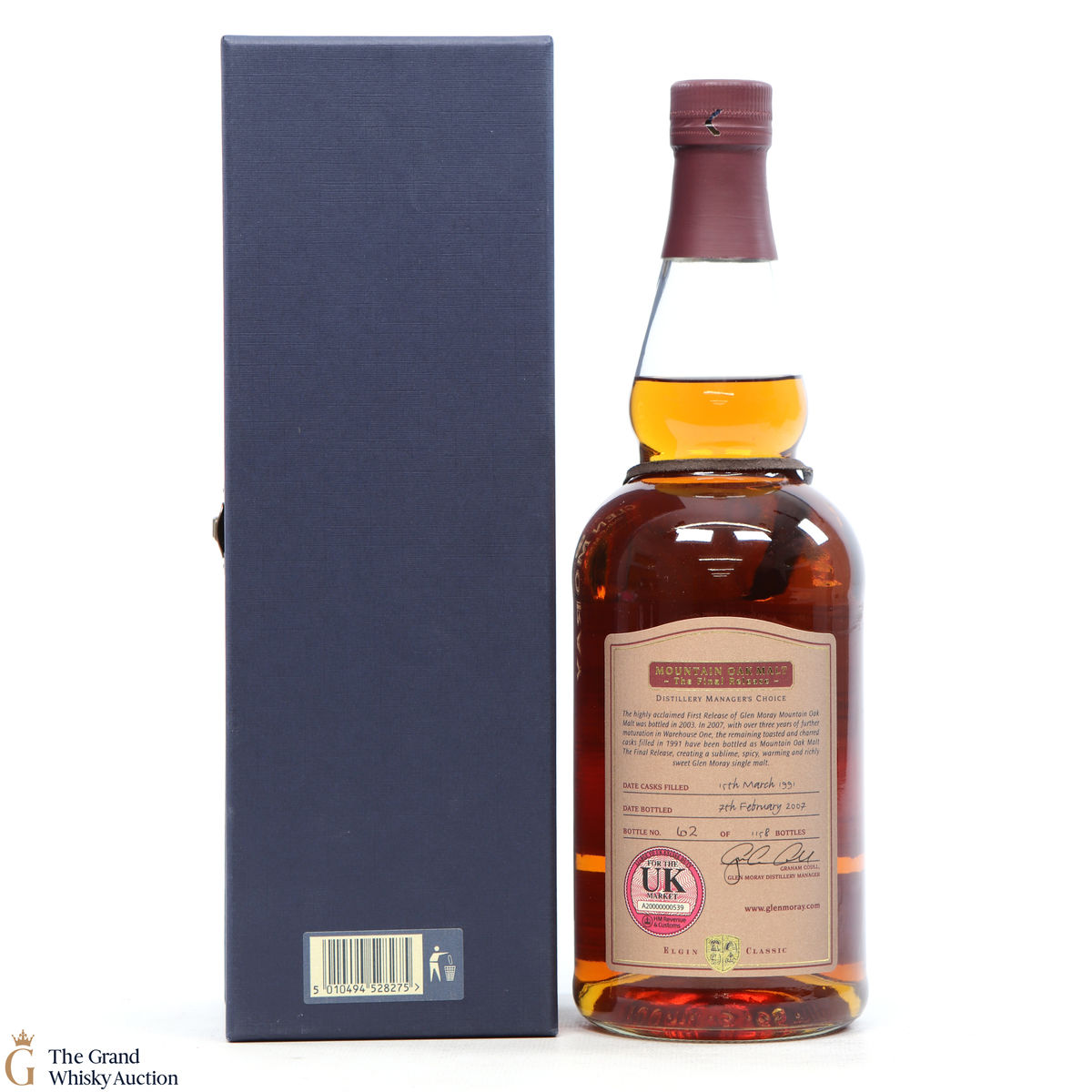 A now rare and discontinued bottling of Glen Moray 1991 Mountain Oak Final Release. Released after the highly acclaimed First Release of Glen Moray Mountain Oak Malt bottled in 2003. The remaining toasted and charred casks filled in 1991 were bottled in 2007, with over three more years of maturation in Warehouse One. This is one of 1158 bottles.