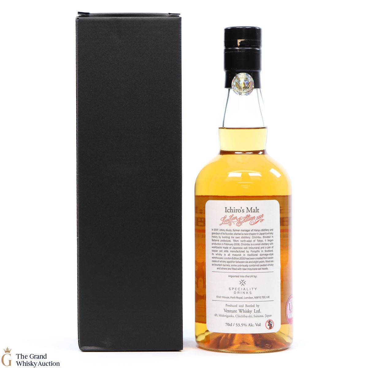 One of just 1736 bottles of the highlight sought after limited-edition Chichibu London (2020) bottlings from the Chichibu Distillery in Japan. Aged for six to eight years and vatted from a total of seven casks including some ex-bourbon barrels previously used to mature peated whisky and casks with new, mizunara-oak ends. Bottled at the cask strength of 53.5% ABV.