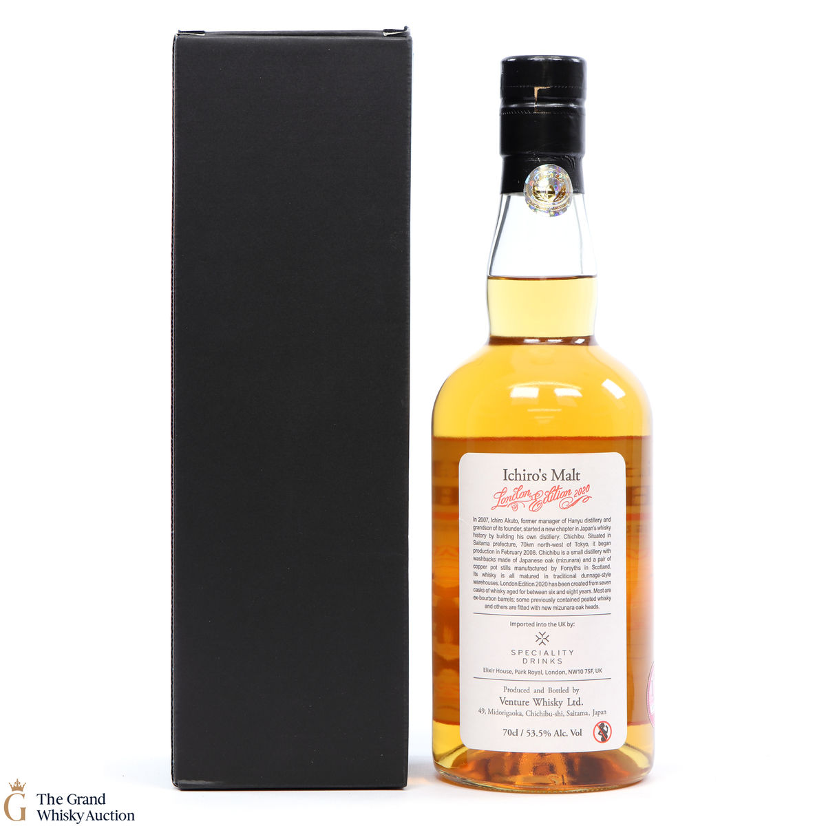 One of just 1736 bottles of the highlight sought after limited-edition Chichibu London (2020) bottlings from the Chichibu Distillery in Japan. Aged for six to eight years and vatted from a total of seven casks including some ex-bourbon barrels previously used to mature peated whisky and casks with new, mizunara-oak ends. Bottled at the cask strength of 53.5% ABV.