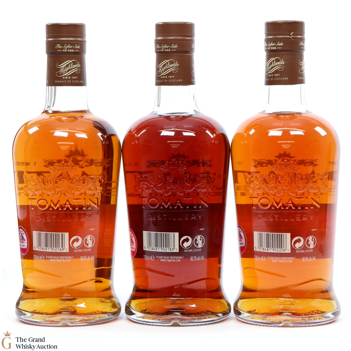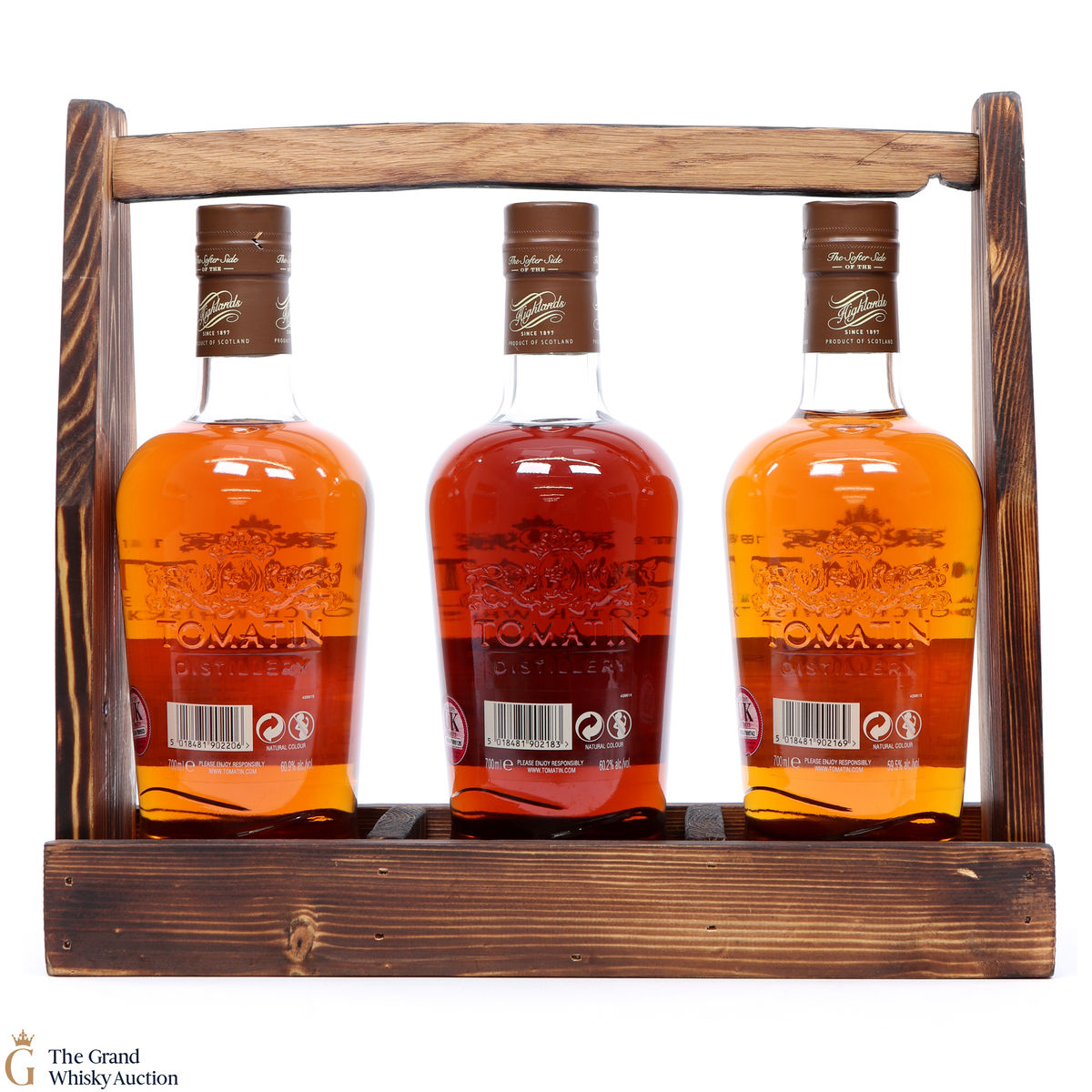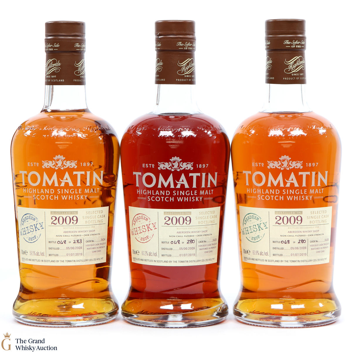 The Tomatin Verdejo Cask Trilogy is the result of a partnership between the Tomatin Distillery and the Aberdeen Whisky Shop. The three releases have been matured in different Verdejo Spanish white wine casks, which is a world first. They were all bottled at cask strength. This lot includes: