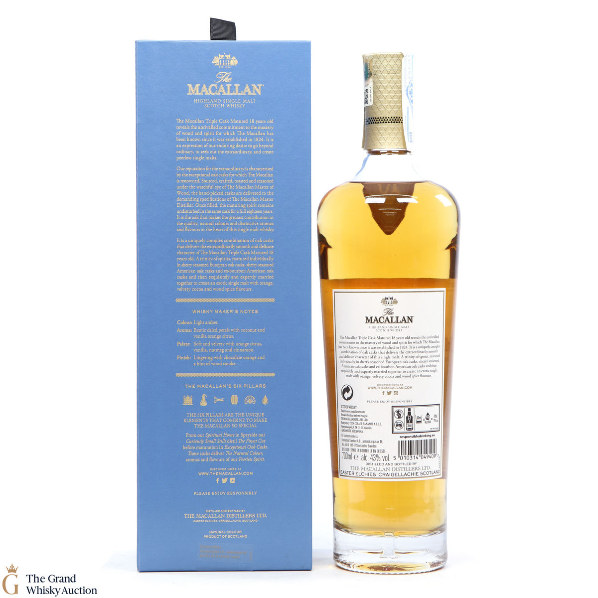 This 18 year old Macallan single malt was released in 2019 and sits is at the top of the Triple Cask range (which replaced the Fine Oak range). The whisky was matured in a combination of European sherry seasoned casks, American sherry seasoned casks and American ex-bourbon casks. This expression boasts bountiful notes of vanilla, dried fruit and woody spice.