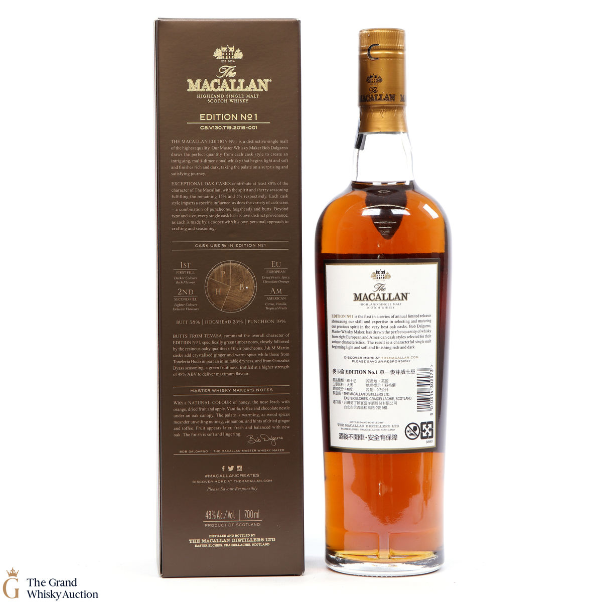 The Macallan Edition No. 1 is the debut expression in the Edition Series.  This is a limited edition drawn from eight European and American oak cask styles selected for their unique characteristics.