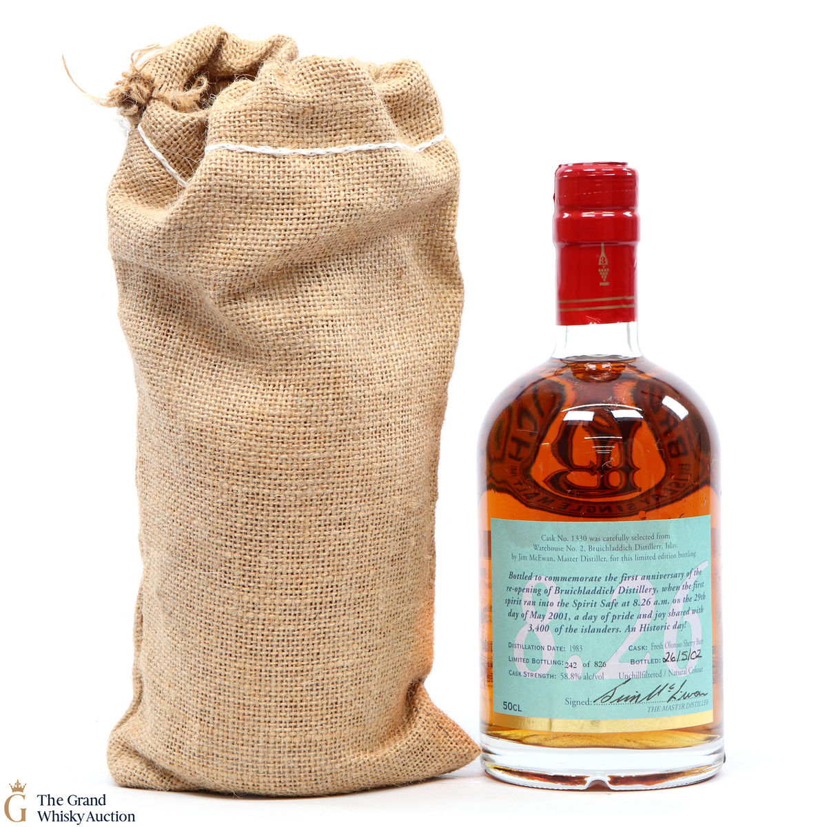 This rare Bruichladdich Islay Single Malt was bottled to mark the first anniversary of the reopening of Bruichladdich - the first spirit ran into the Spirit Safe at 8.26 am on the 29th of May, 2001.