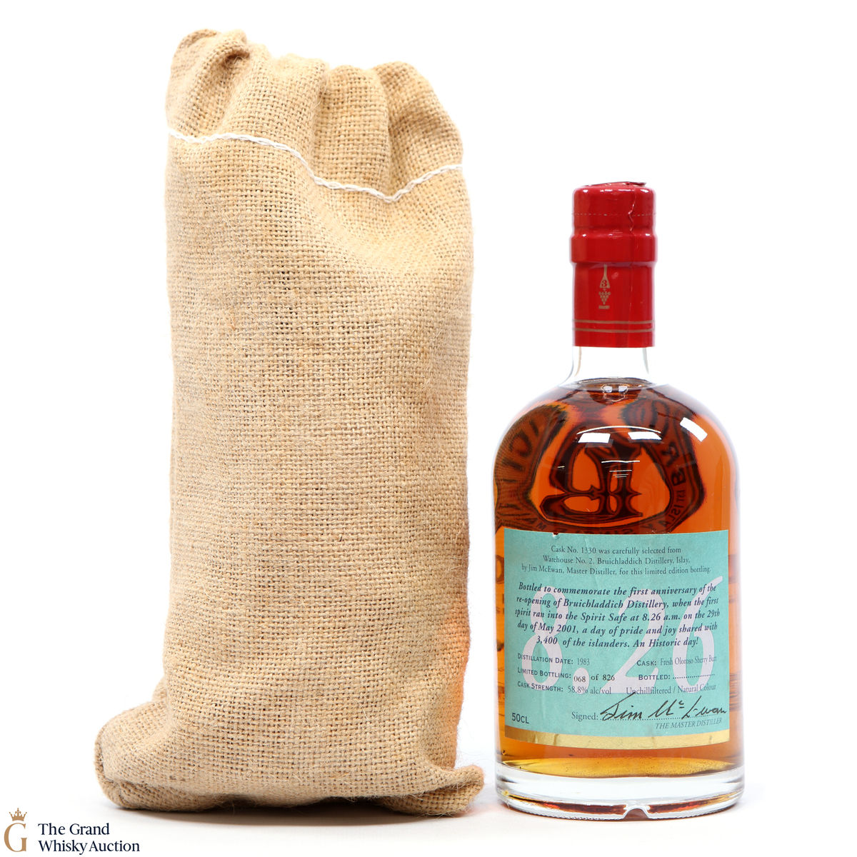 This rare Bruichladdich Islay Single Malt was bottled to mark the first anniversary of the reopening of Bruichladdich - the first spirit ran into the Spirit Safe at 8.26 am on the 29th of May, 2001.