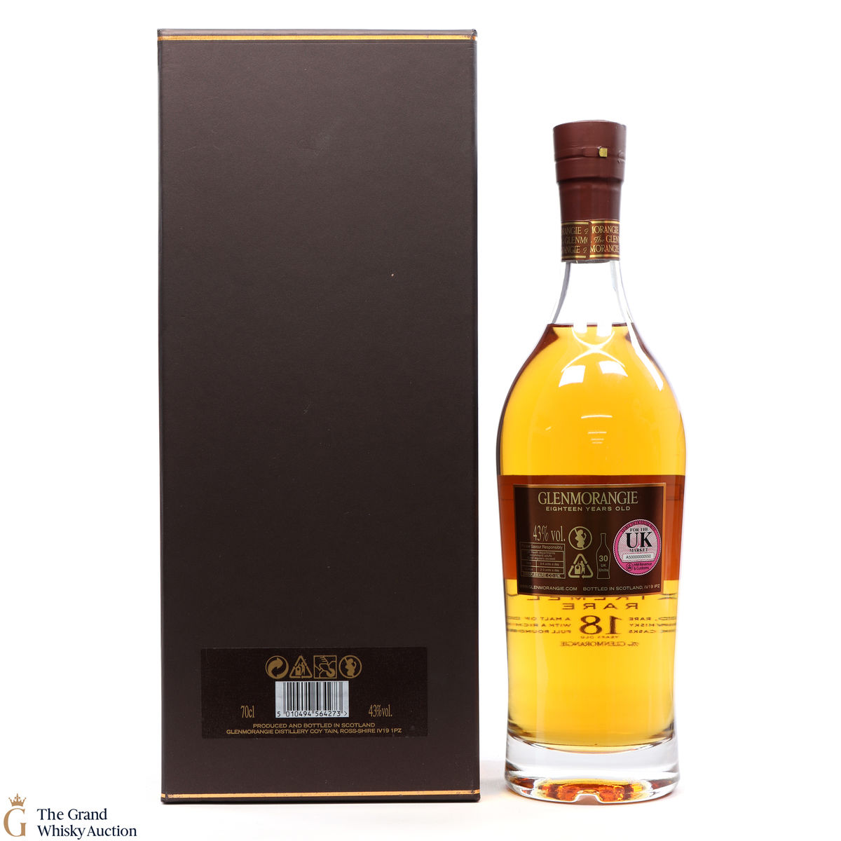 This bottle is an 18 year old Extremely Rare, Highland single malt produced by Glenmorangie. It has been perfected by the sixteen men of Tain who have specially aged this bottle for 18 years in superior oak casks and a period in Oloroso Sherry casks.