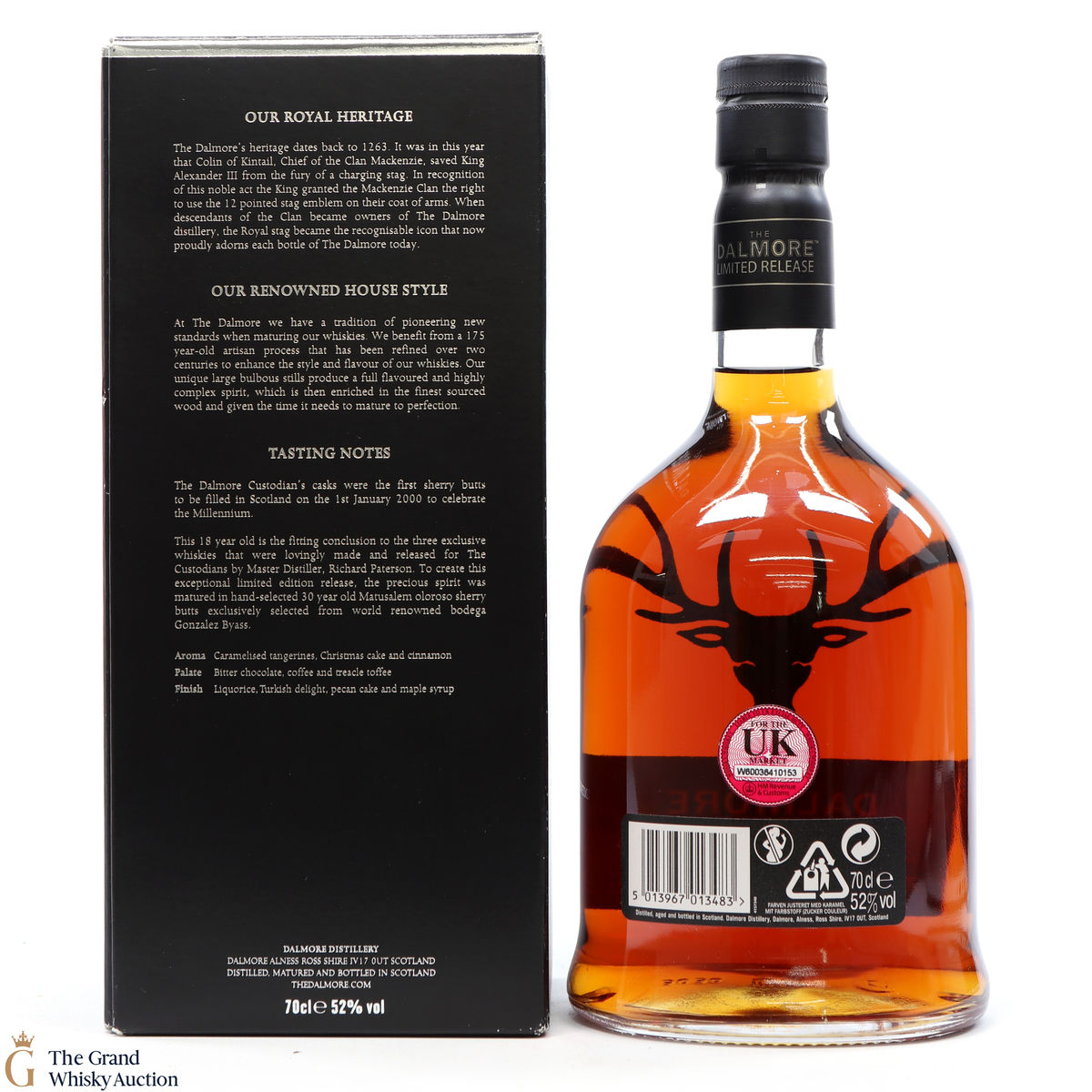 This bottle is a 2018 release of The Dalmore Custodian's casks were the first filled sherry butts to be filled in Scotland on the 1st January 2000 to celebrate the Millennium.