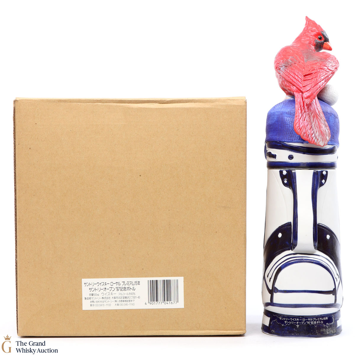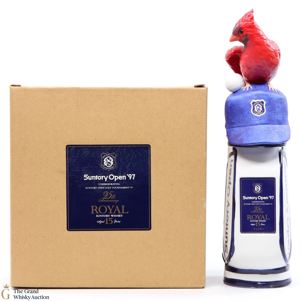 This particular 15-year-old Suntory whisky is presented in a specially shaped golf bag bottle featuring a bird perched on top. It commemorates the Suntory Open Golf Tournament 1997.