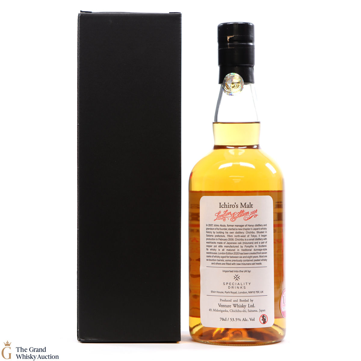 One of just 1736 bottles of the highlight sought after limited-edition Chichibu London (2020) bottlings from the Chichibu Distillery in Japan. Aged for six to eight years and vatted from a total of seven casks including some ex-bourbon barrels previously used to mature peated whisky and casks with new, mizunara-oak ends. Bottled at the cask strength of 53.5% ABV.