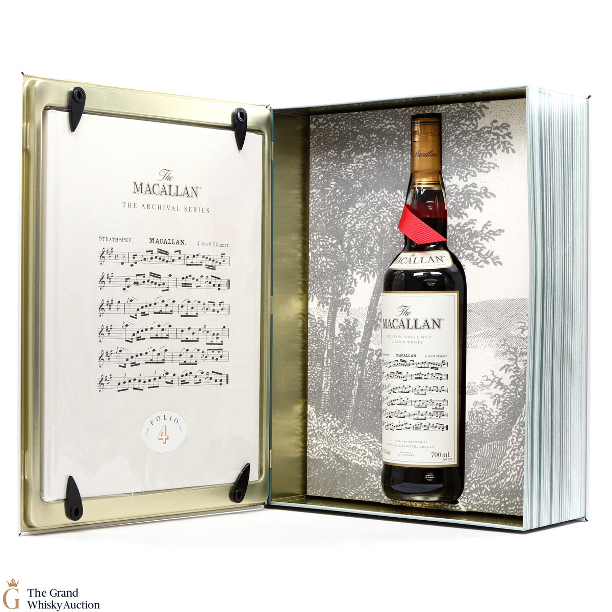 The fourth edition in the Archival Series from The Macallan. Folio 4 remembers the legendary advertising campaigns of the 1970s, 1980s and 1990s that brought The Macallan to the public’s attention outside of Scotland. It is presented in a beautiful book shaped, tin case. It features an advertisement including a Strathspey composed by James Scott Skinner (1843-1927). The advert notes that Skinner was so moved by his favourite malt he created a unique piece of music featuring his signature lilting notes with the simple catchphrase: “The Macallan. The Malt.”