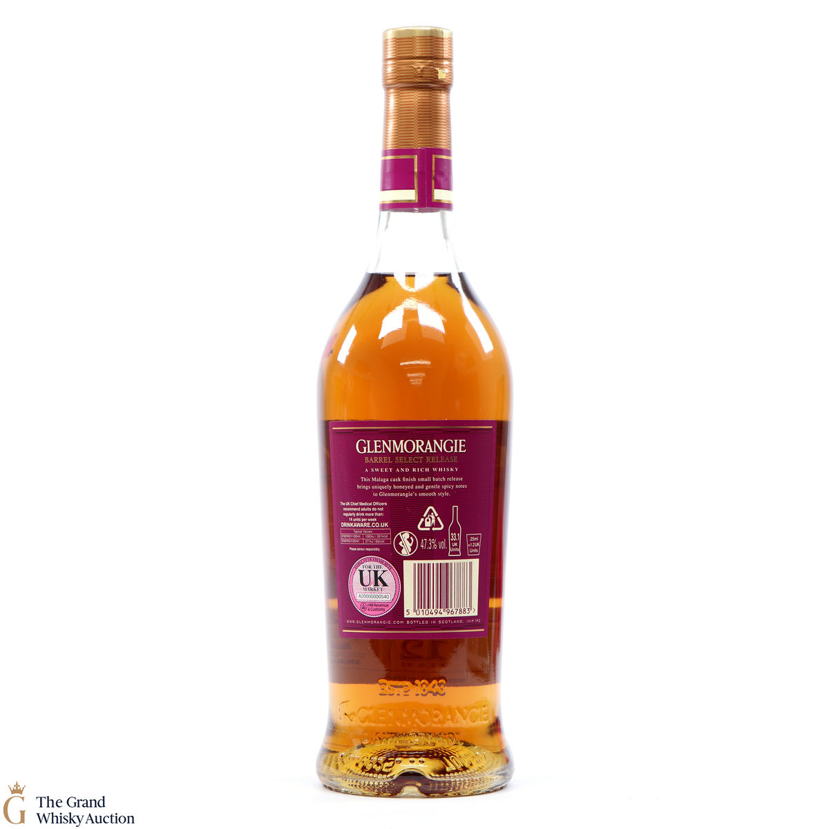 Due to the various ages of bottles and their seals, the condition of liquid is at the buyer's discretion and no claim can be lodged against failure/leakage in transit. Loss and breakage cover is available at 3% of the hammer price as standard. If the lot is not insured, no claim can be lodged against the courier or The Grand Whisky Auction for breakage or loss in transit.