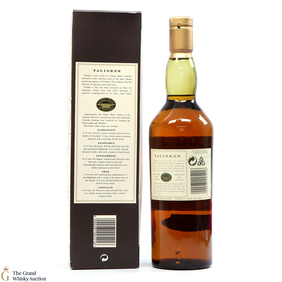 An older release of 10 Year Old from Talisker distillery on the Isle of Skye. Aged for a minimum of 10 years in American oak casks. The bottle label and the box feature a map of Skye.