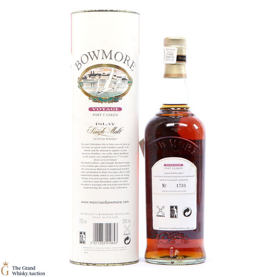 The Bowmore voyage is a non-aged statement Bowmore matured in bourbon casks before being finished in port pipes. Released in 2000 and individually numbered.