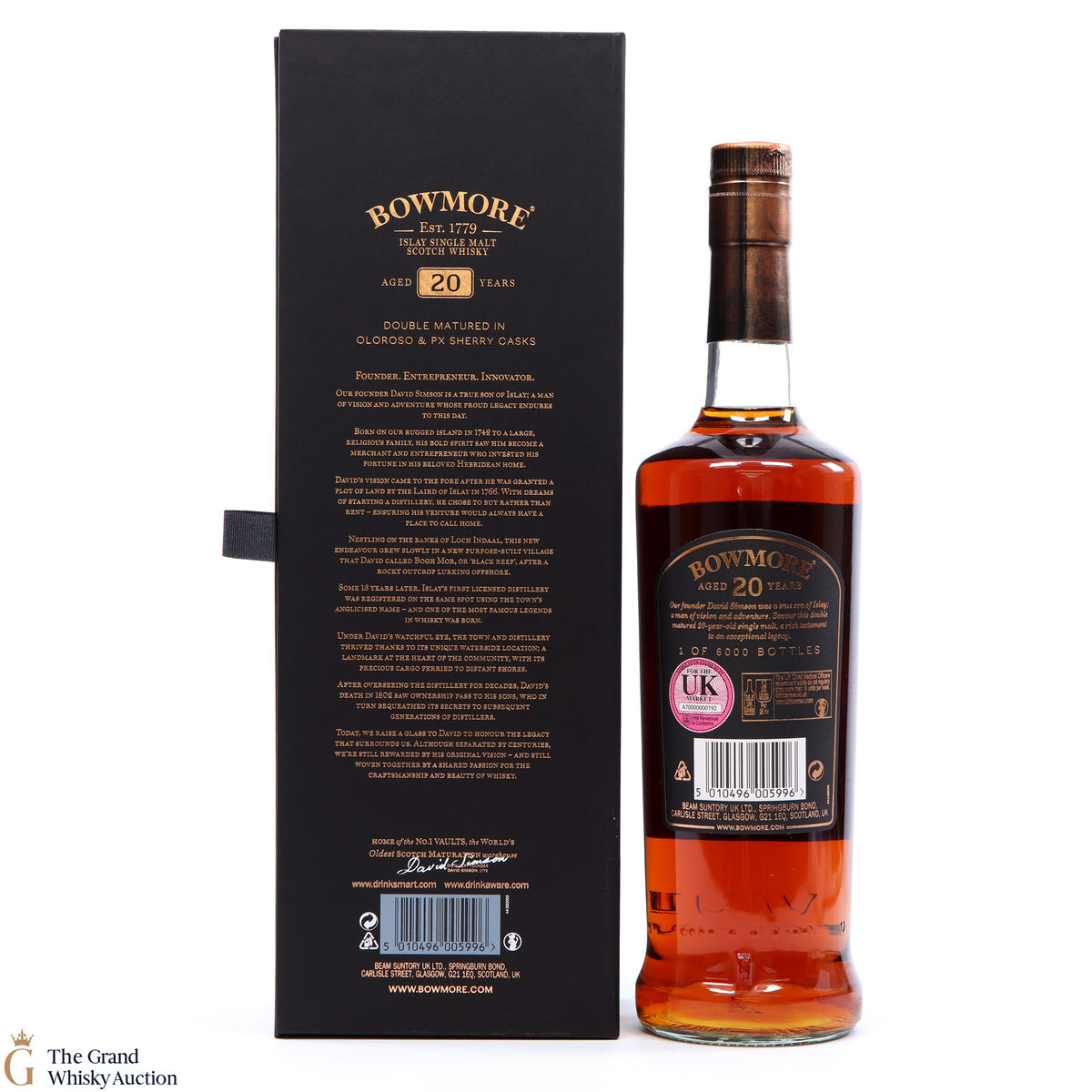 This 20-year-old celebrates and is a testament to the founder of Bowmore. This dram has gone through a double maturation period of 15 years in Oloroso Sherry Butts followed by 5 years in a first fill PX Butts. One of only 6000 bottles.