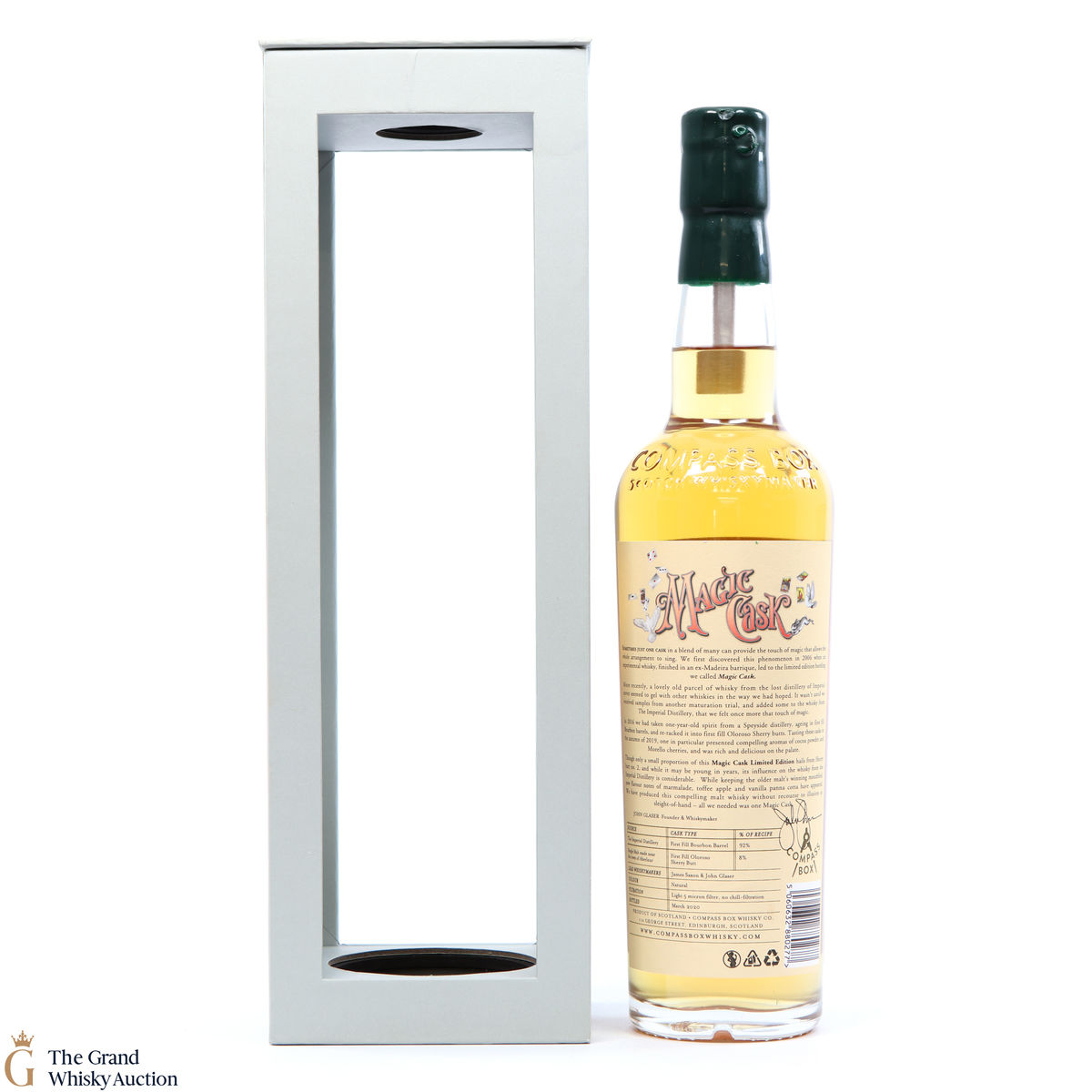 Compass Box has launched Magic Cask Whisky, a limited edition blended malt to showcase how 'one cask in a blend of many can provide the touch of magic that allows the whole arrangement to sing'. Compass Box matched a parcel of first-fill Bourbon barrels containing whisky from the now-closed Imperial Distillery with much younger malt whisky from the Oloroso-seasoned casks to Bottled at 46% ABV. This is one of just 5,538 bottles.