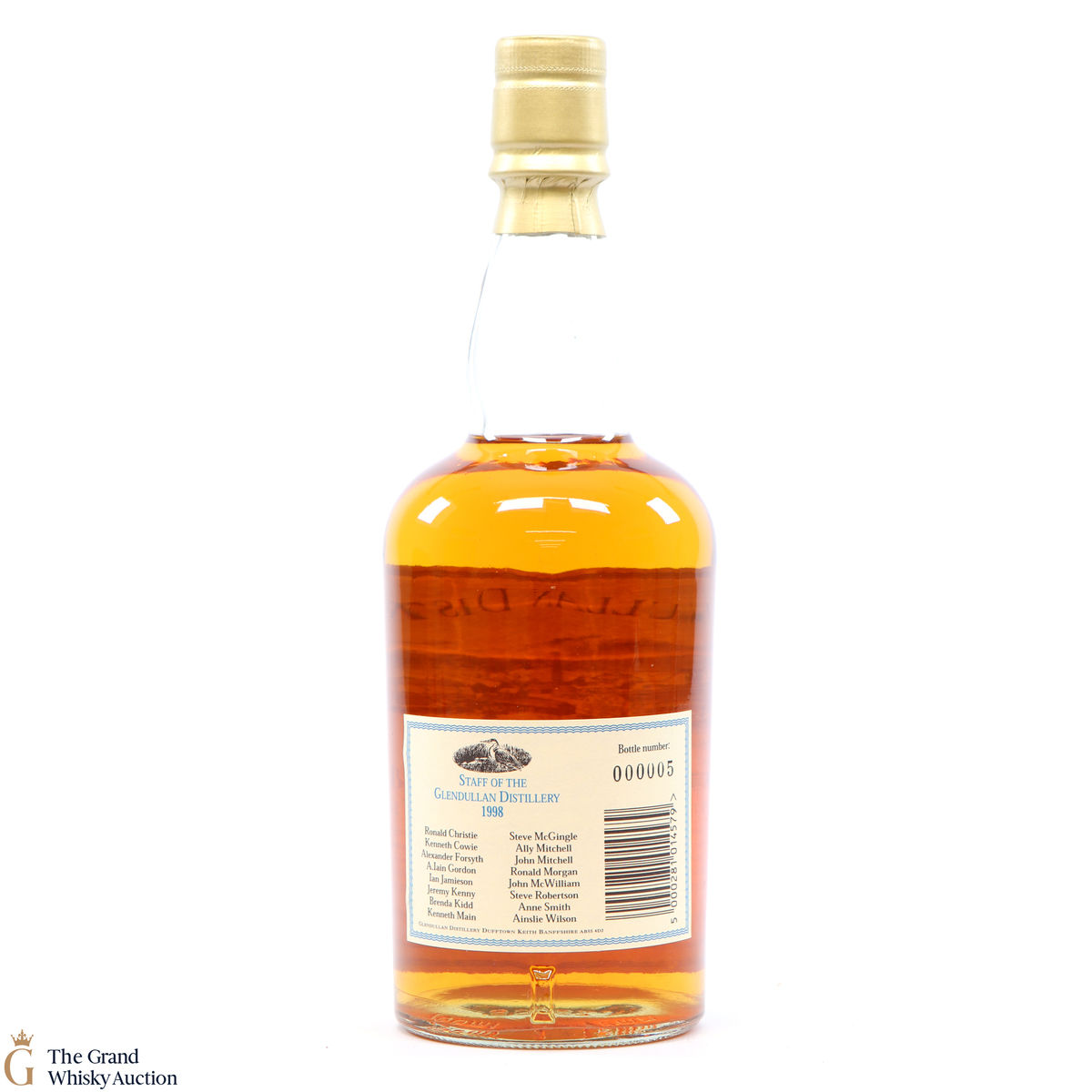 The label on the back of the bottle features the 16 staff of the distillery in 1998.