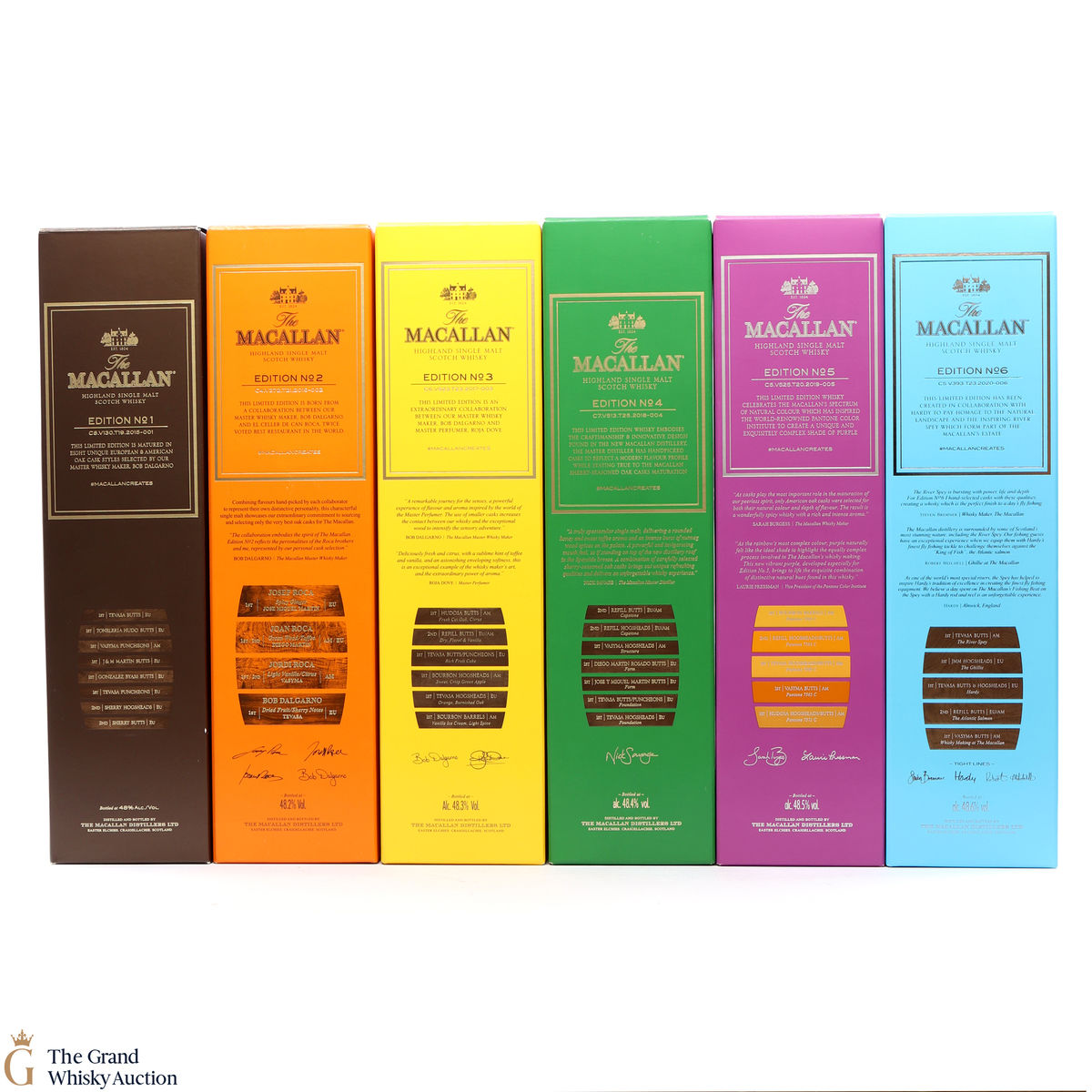 This lot brings together the Macallan Edition set to date, comprising of Edition no. 1, 2, 3 4, 5 & 6 in the annual limited edition series.