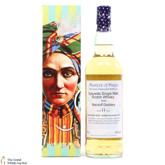 An 11-year-old 2008 Macduff single malt from indie bottler High Spirits. Bottled in November 2019 at 46%, as part of the Master of Magic series.