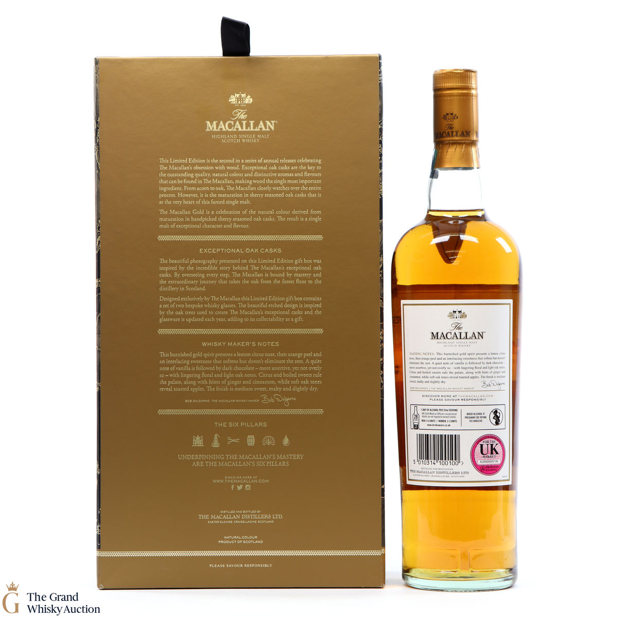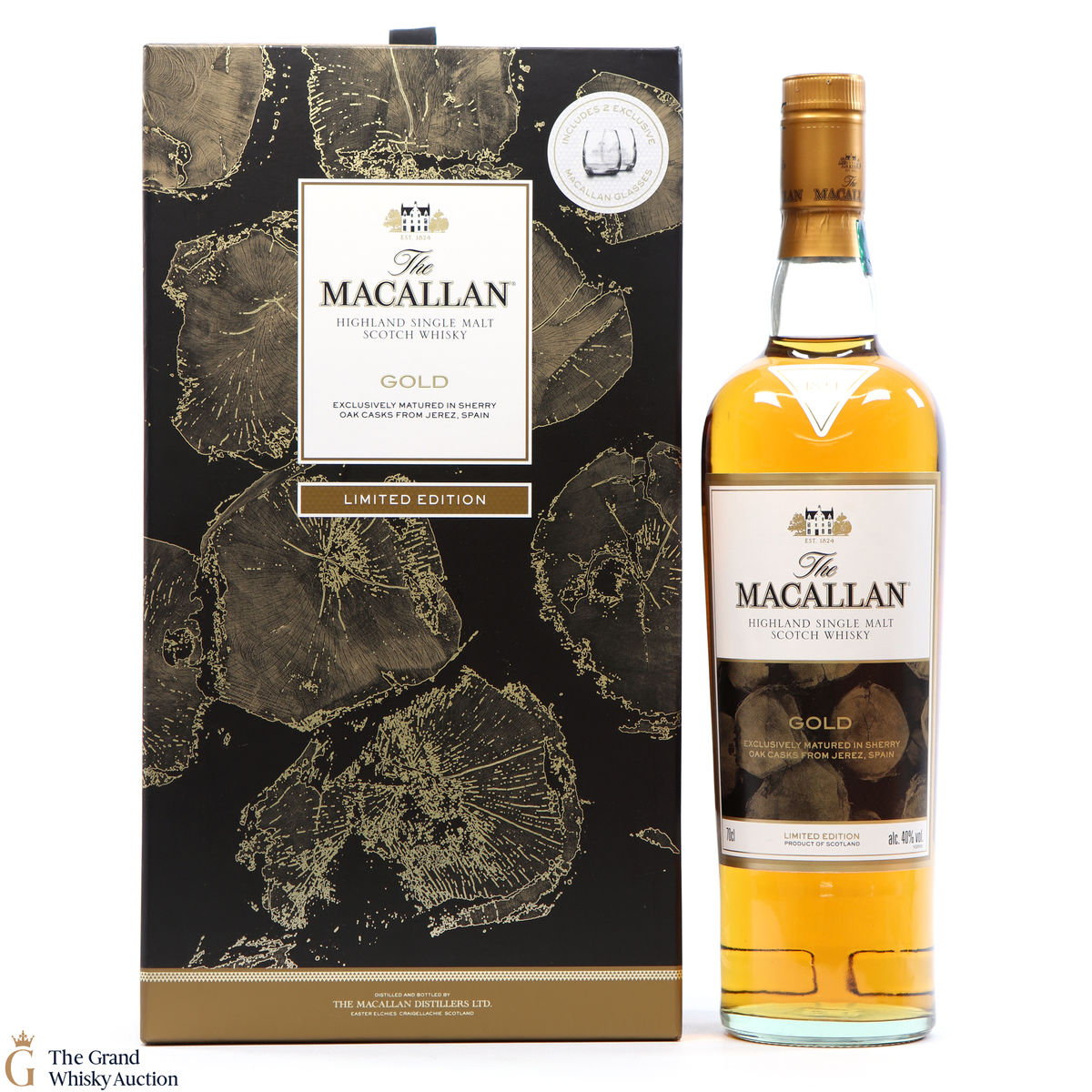 A stylish Macallan gift pack. It contains a 70cl bottle of the Gold expression from their 1824 Series, and two limited edition branded Macallan Whisky tumblers.