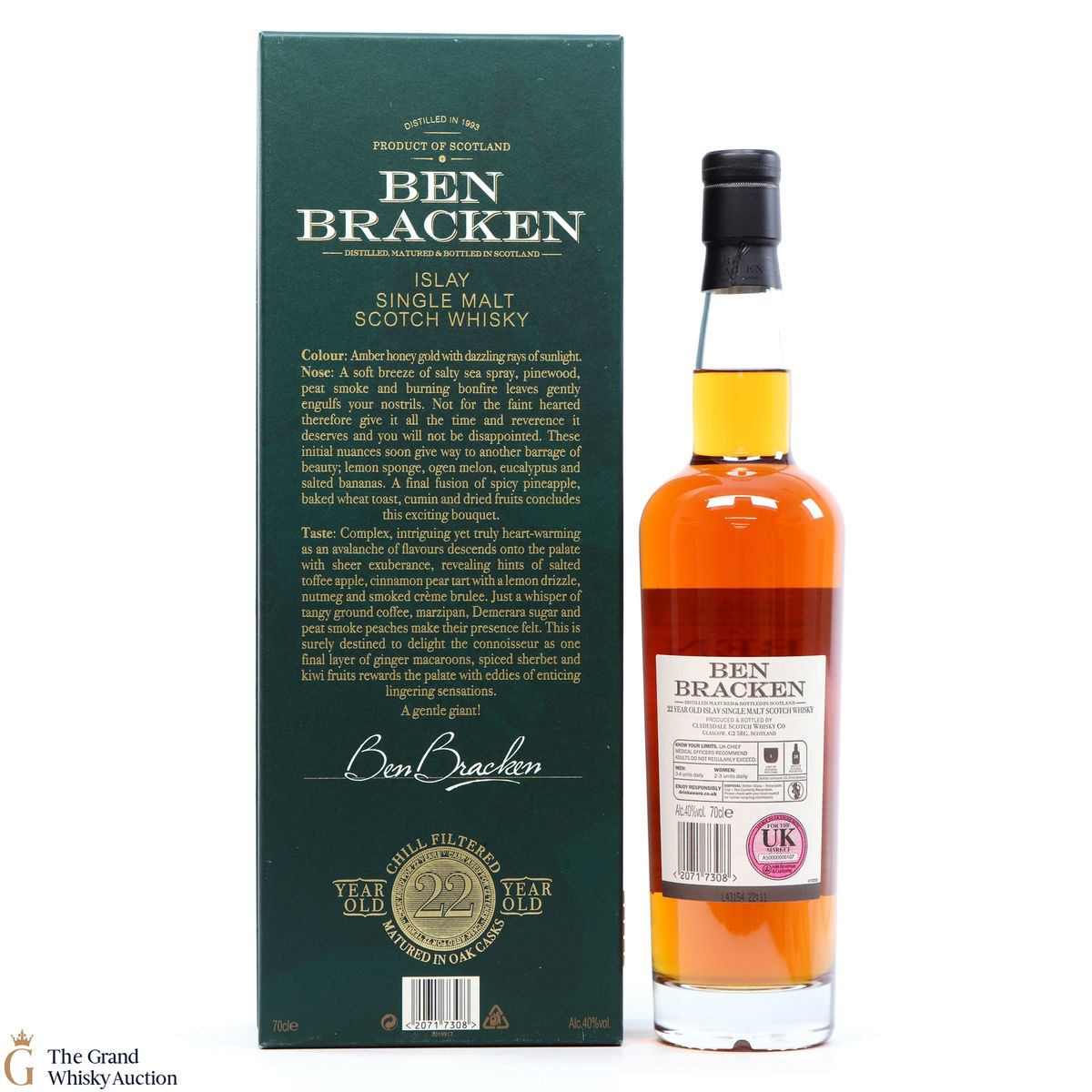 This Ben Bracken 22-Year-Old single malt from Speyside was matured in oak casks. It was produced at an undisclosed distillery and bottled by Clydesdale Scotch Whisky Co. for Lidl and comes in a smart green presentation box.