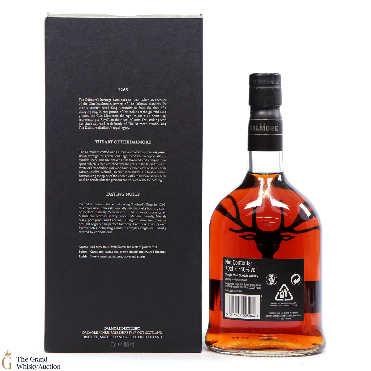 To make The Dalmore King Alexander III, Master Distiller Richard Paterson specially selected 6 casks of differently aged Dalmore malts matured in wine, Madeira, sherry, marsala, Kentucky bourbon and port casks.  A remarkable feat of blending crafted to honour the act of saving Scotland's King in 1263.  It is a rich, fruity Highland single malt.