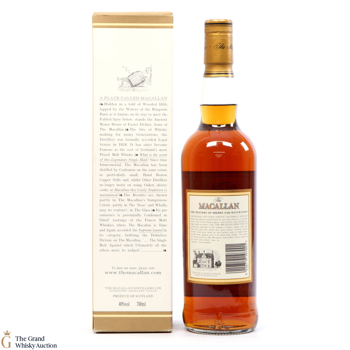 This is an old-style of Macallan 10 Year old was bottled in the 1990s. This classic Speyside malt whisky matured in sherry oak casks from Jerez. Very collectable.