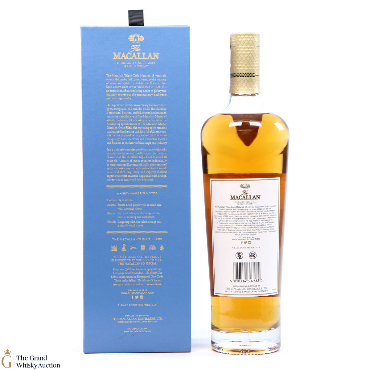 This 18 year old Macallan single malt was released in 2019 and sits is at the top of the Triple Cask range (which replaced the Fine Oak range). The whisky was matured in a combination of European sherry seasoned casks, American sherry seasoned casks and American ex-bourbon casks. This expression boasts bountiful notes of vanilla, dried fruit and woody spice.