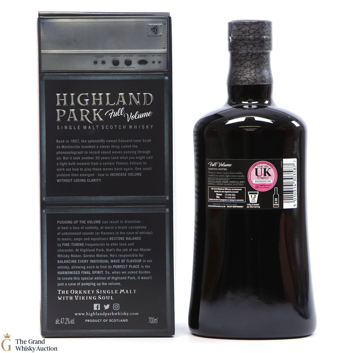Full Volume by Highland Park was distilled in 1999 and bottled in 2017 from 481 casks. The single malt was matured exclusively in first-fill bourbon casks and was bottled at 47.2% ABV and comes presented in a themed presentation box resembling speaker.
