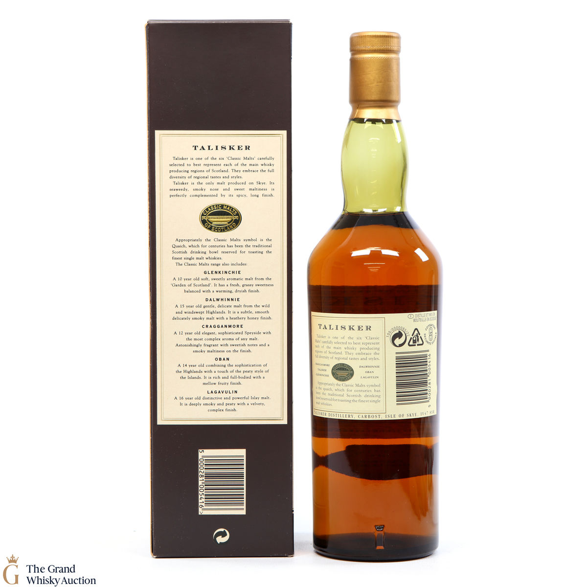 An older release of 10 Year Old from Talisker distillery on the Isle of Skye. Aged for a minimum of 10 years in American oak casks. The bottle label and the box feature a map of Skye.