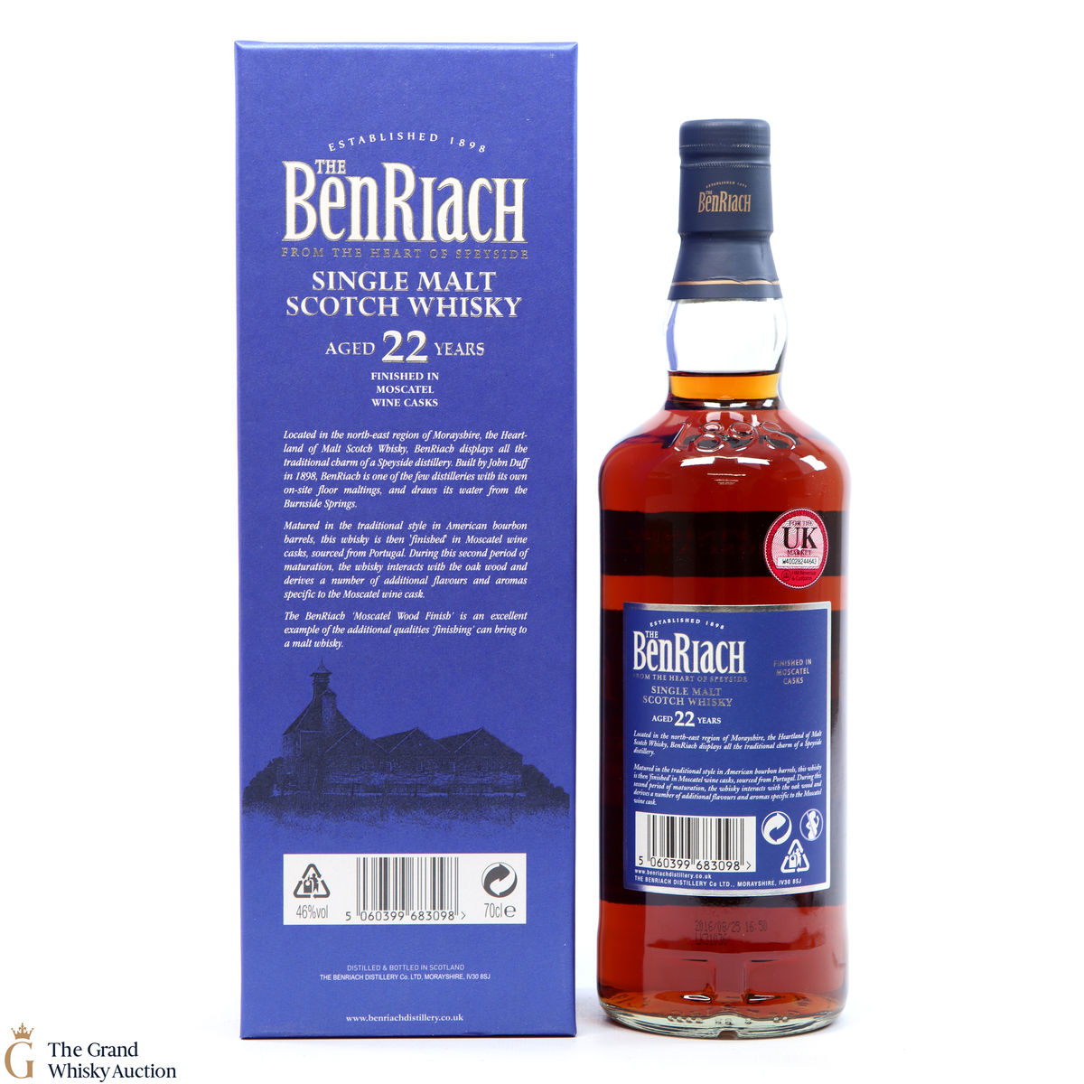 A 22-year-old single malt from the BenRiach distillery, aged in American bourbon barrels and finished in casks that previously held Moscatel wine. This finishing period has given a rich, fruity sweetness to the whisky.