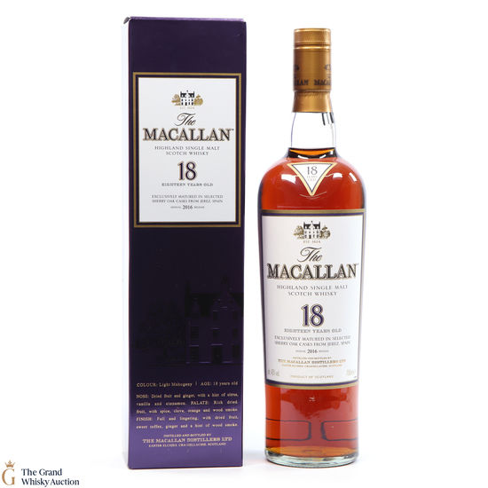 This Macallan 18 Year Old Single malt was bottled in 2016 in Speyside Scotland. This classic was one of the last bottles in this shape. It is now becoming rarer and a staple item in a collectors cellar!