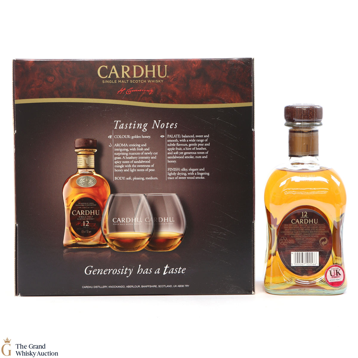 Cardhu 12-year-old single malt whisky from Speyside, Scotland. This single malt was purely produced at the distillery in Morayshire, Scotland. Although recognised as a Speyside whisky, they actually advertise being Highland Scotch Whisky.