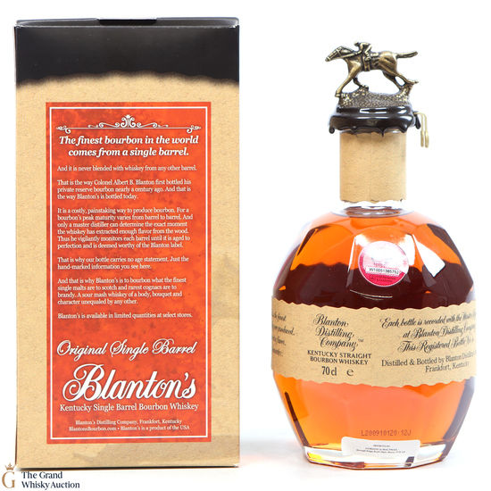 Blanton's Single Bourbon is normally 6 to 8-year-old bourbon, aged in Warehouse H at Buffalo Trace in the metal-clad warehouse at the distillery. The metal, transfers heat quicker than brick warehouses, allowing for faster ageing.