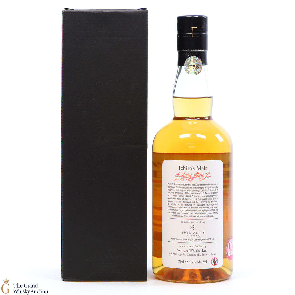 One of just 1736 bottles of the highlight sought after limited-edition Chichibu London (2020) bottlings from the Chichibu Distillery in Japan. Aged for six to eight years and vatted from a total of seven casks including some ex-bourbon barrels previously used to mature peated whisky and casks with new, mizunara-oak ends. Bottled at the cask strength of 53.5% ABV.