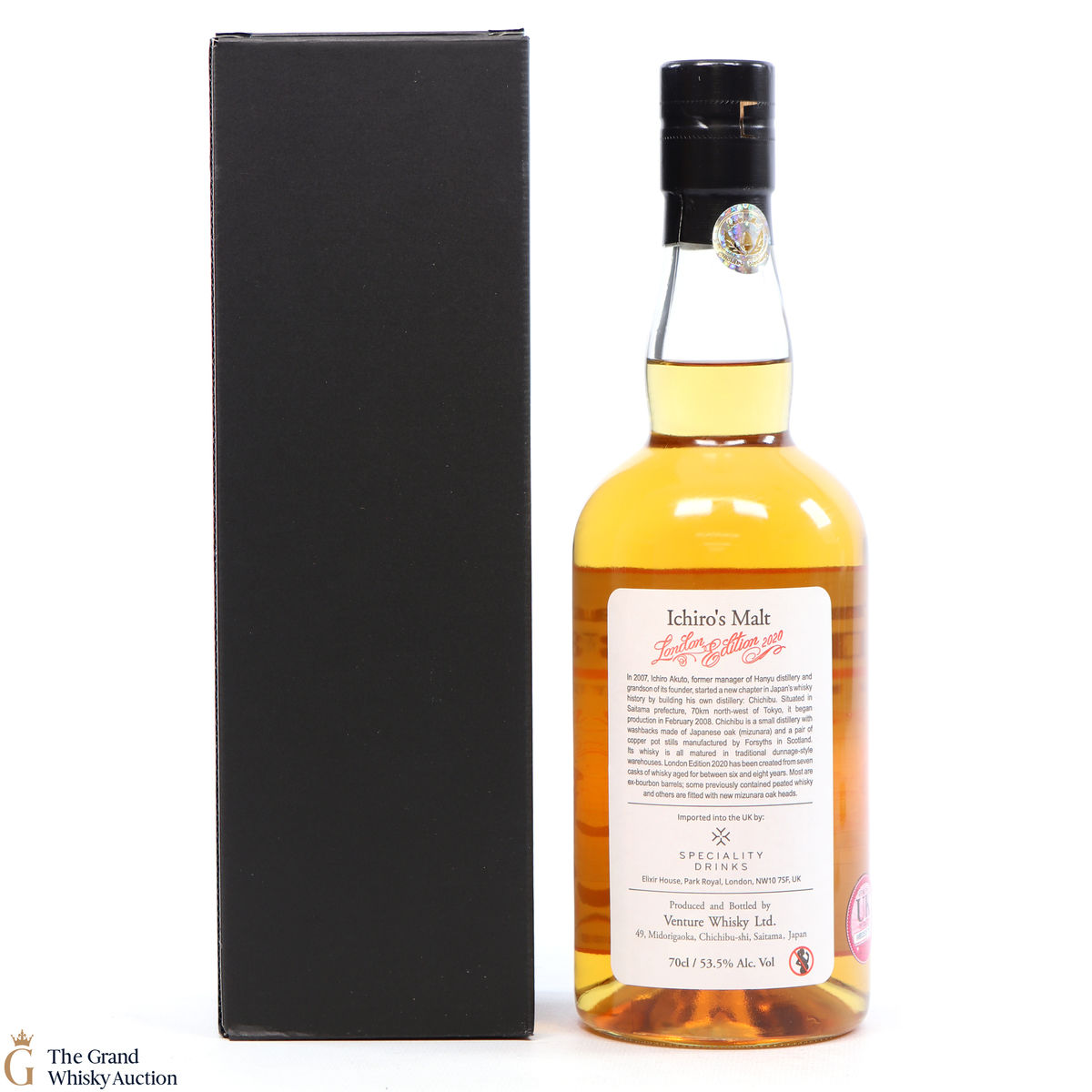One of just 1736 bottles of the highlight sought after limited-edition Chichibu London (2020) bottlings from the Chichibu Distillery in Japan. Aged for six to eight years and vatted from a total of seven casks including some ex-bourbon barrels previously used to mature peated whisky and casks with new, mizunara-oak ends. Bottled at the cask strength of 53.5% ABV.