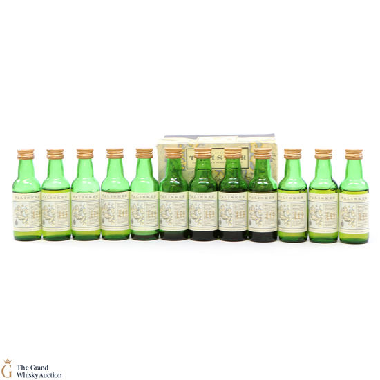 A box of 12 x 5cl bottles of older release of 10-Year-Old from Talisker distillery on the Isle of Skye. Aged for a minimum of 10 years in American oak casks. The bottle label and the box feature a map of Skye.