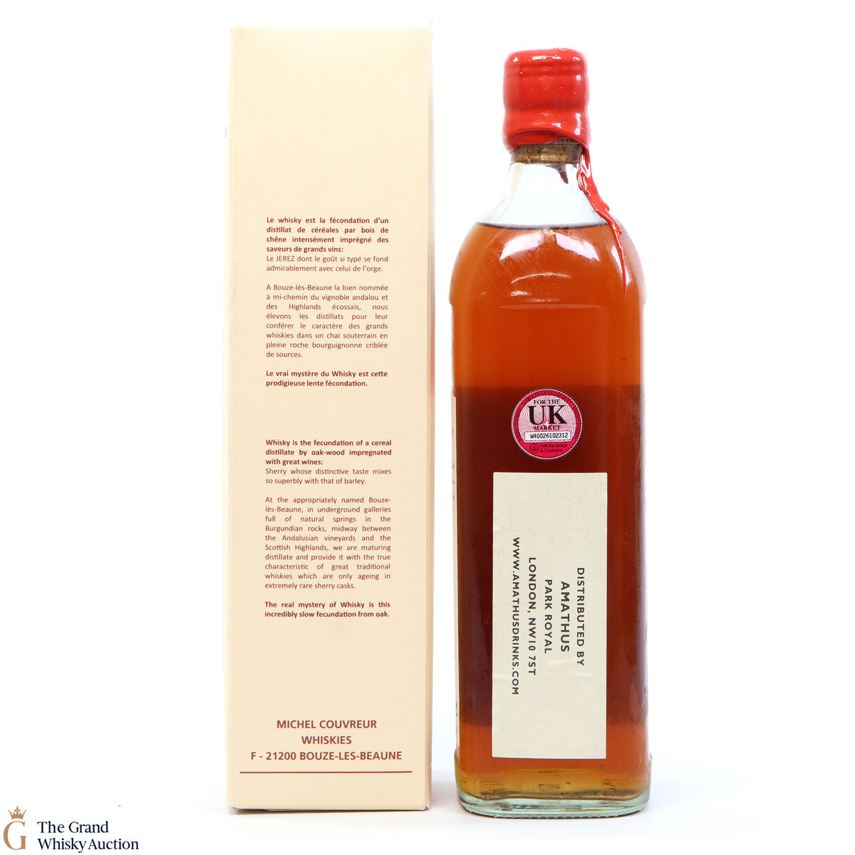 The Michel Couvrer whiskies are produced in Scotland and shipped to Burgundy, France where maturation takes place in a variety of wine casks. This "Candid Malt" is a blended malt whisky matured in sherry casks. This expression is bottled at 49%.