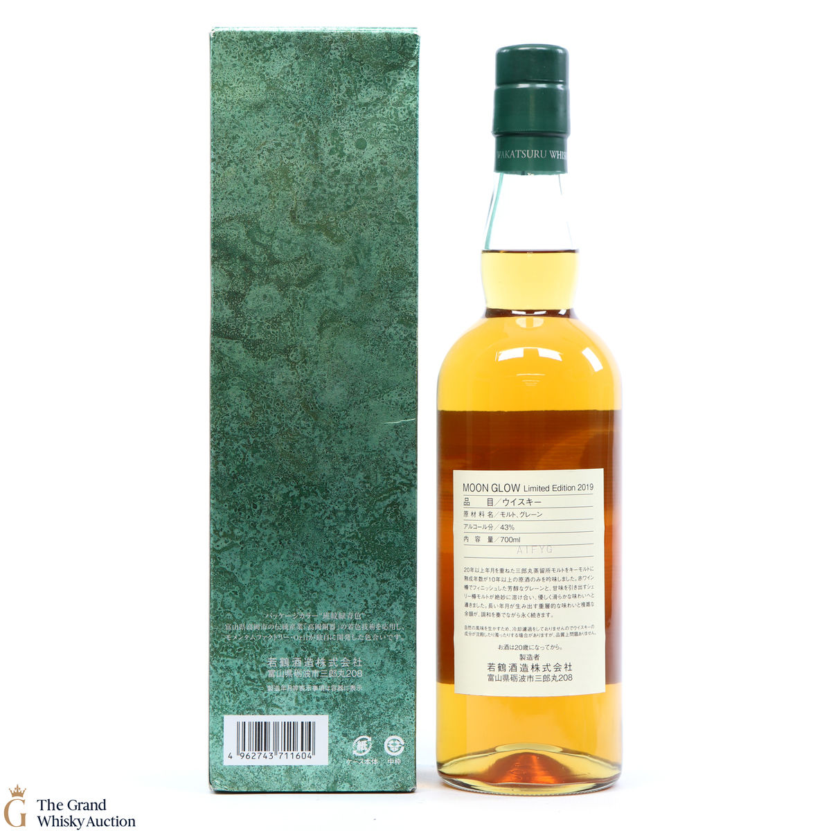 Moon Glow Limited Edition 2019 from the Wakatsuru Brewery, a blended whisky primarily created with 20-year malt and blended with others at least 10 years of age. in this annual release, the grain component was finished in red wine casks.