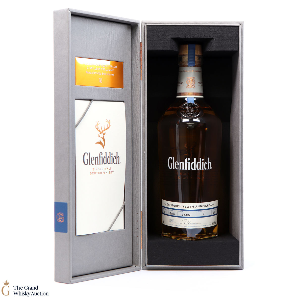 This is a Gallery Bottle from Glenfiddich that has been personalised with the colour of the label, the colour of the box and a personalised message. This one includes 'Glenfiddich 130th Anniversary'.